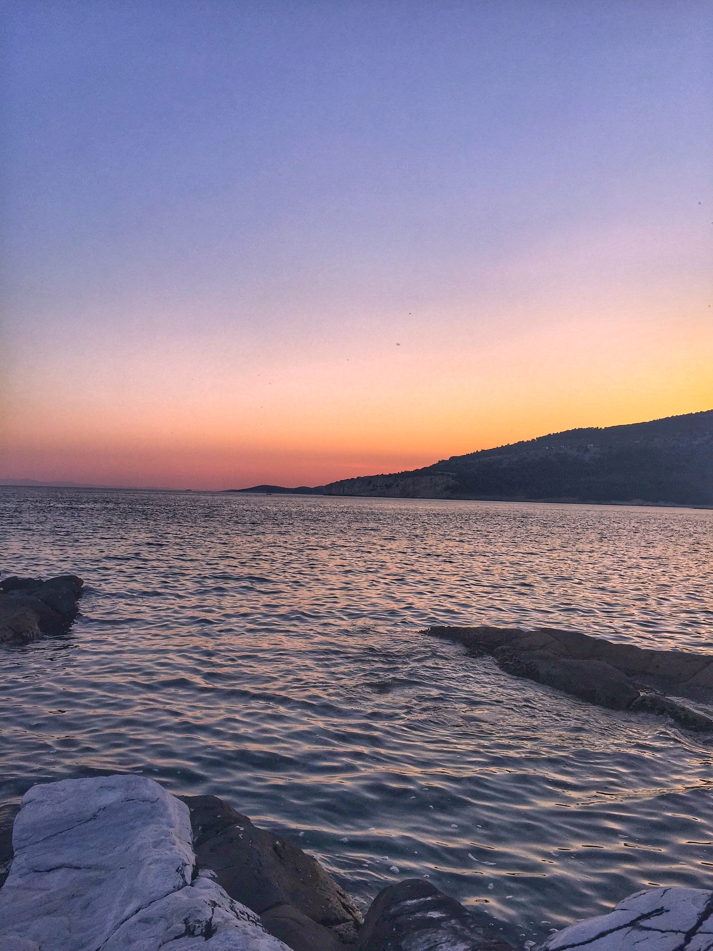 Вечер, когато изчезнат тълпите туристи, които плажуват или се разхождат по екопътеката, можеш наистина да усетиш магията на мястото. Освен нашата къща, там има само още две или три други места за настаняване, съответно няма никой почти. Задължително идете там привечер, за да се разходите по скалите около екопътеката и да гледате залеза – обещавам, фантастично е, а какви добри снимки стават там…. Ние отиваме с бутилка вино и се настаняваме на скалите да се полюбуваме на залеза и морето. Ако пък сте ранобудни, можете да посрещнете и изгрева – просто отивате на другата страна на полуостровчето.