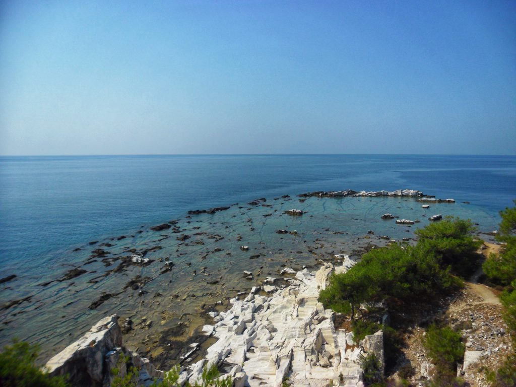 По – нататък по пътя се намира действащата мраморна кариера, през която също има път за плажовете започващ близо до Панагия, но не ви го препоръчвам – екстремен е (еднопосочен е – може само да се слиза надолу по него). До кариерата е доста известният мраморен плаж – Porto Vathy – преди да направят заведението беше доста по-приятно там – буквално нямаше никой, ама наистина никой. Всички плажуваха на най-известния Saliara beach – заоблени мраморни камъчета и дълбоки небесно сини води. До плажа има голям прашен паркинг, също така има и бар. Само една година имахме късмет да няма никакво заведение, но като цяло той е най-популярният плаж, защото е първи по пътя от Макриамос и хората не си правят труда да продължават натам към другите два плажа.