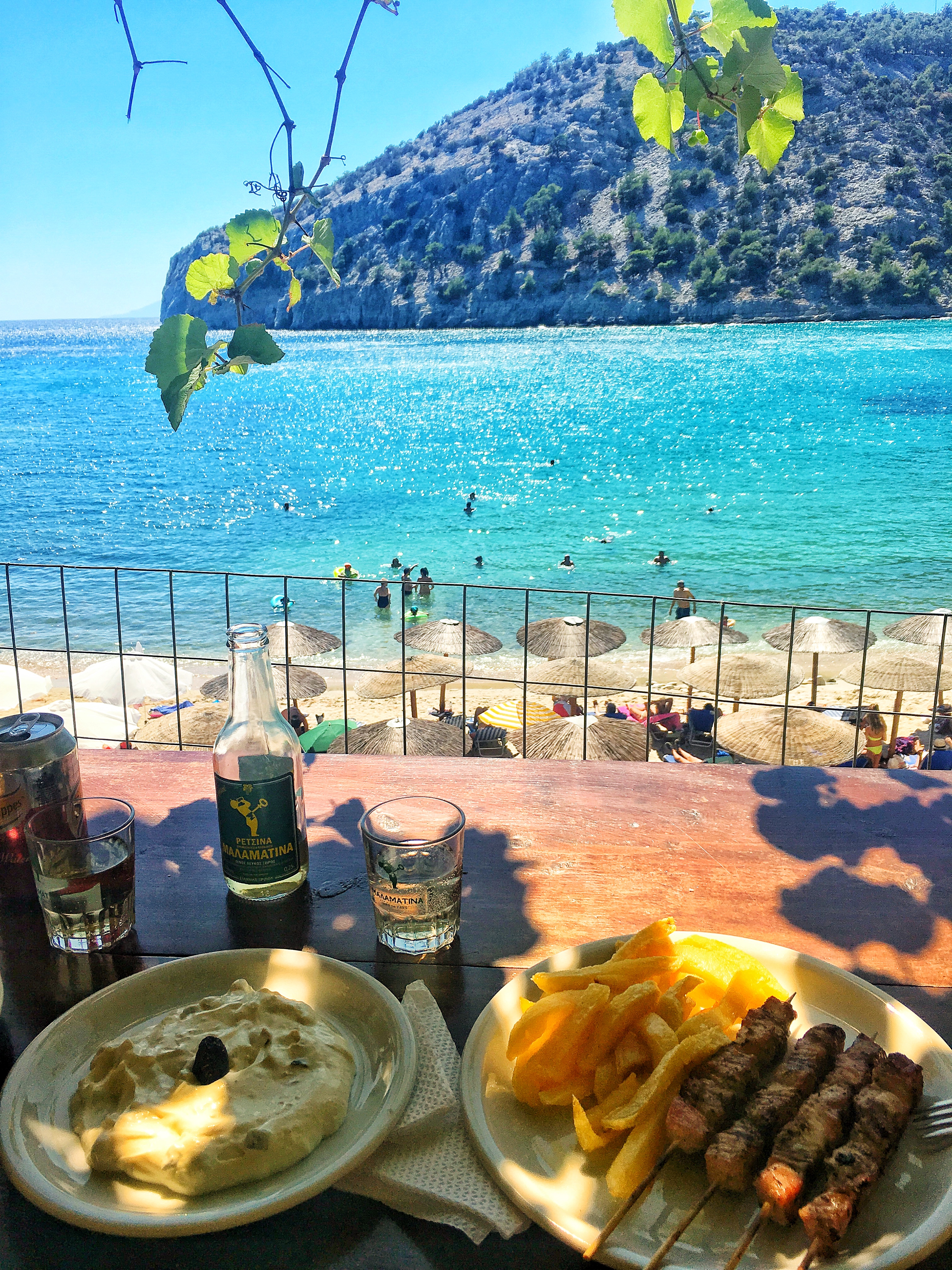 Другото предимство на мястото е фактът, че таверните на плажа вечер са празни. Наслаждаваш се на морето и храната си без излишен шум. А храната там е наистина добра и тъй като често си единственият клиент, ти обръщат нужното внимание. Която и таверна да изберете няма да сбъркате, но ние предпочитаме Leonidas – последната в редицата. Порция риба ципура там струва 9 евро! а е супер вкусна и нашето любимо – октопод на скара – много места в Гърция сме обиколили и никъде другаде не го готвят както там – цаката е, че не го варят преди да го опекат на скарата, уж за да стане по – крехък, но така само загубва вкуса си. Сушен на слънце и после опечен – просто, но супер вкусно! А и да не забравя – порцията като големина е повече от добра!