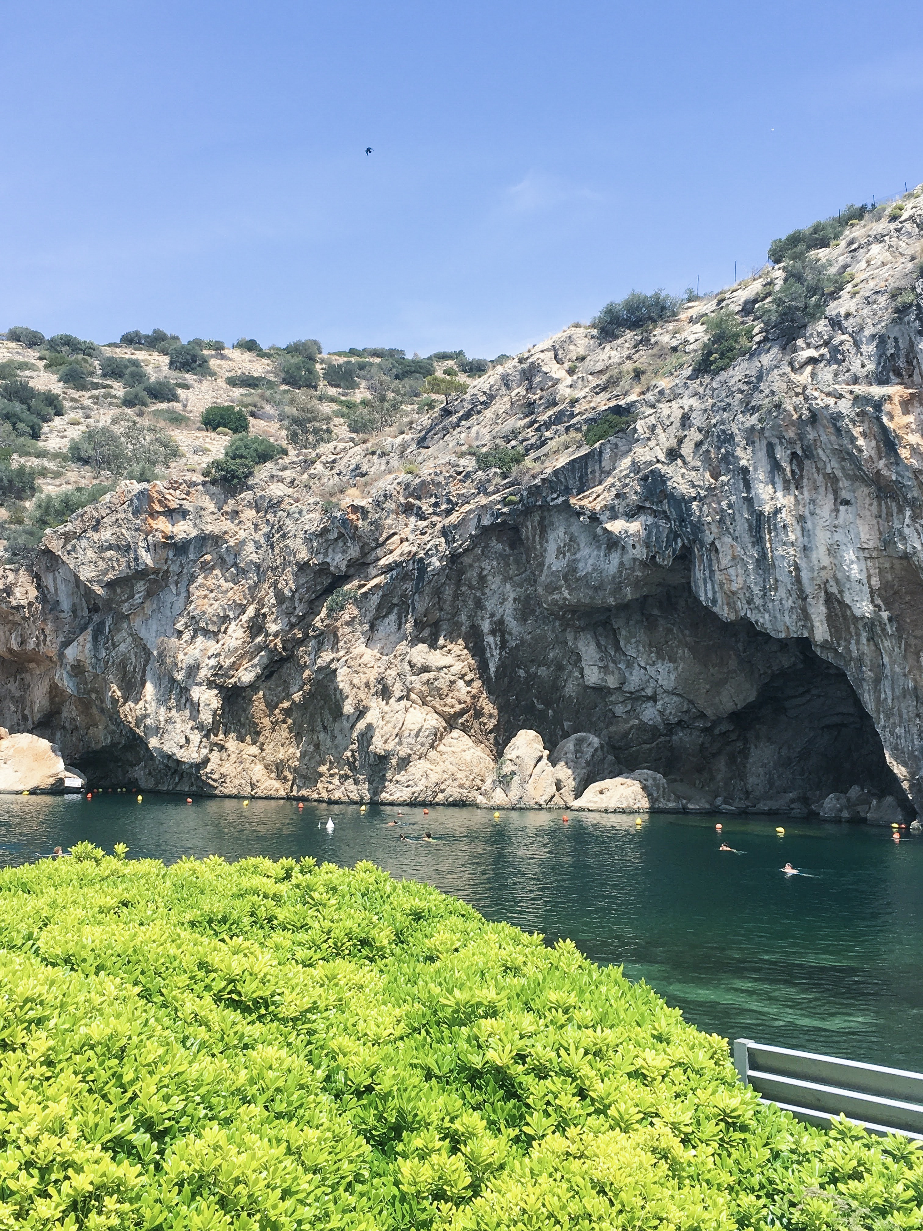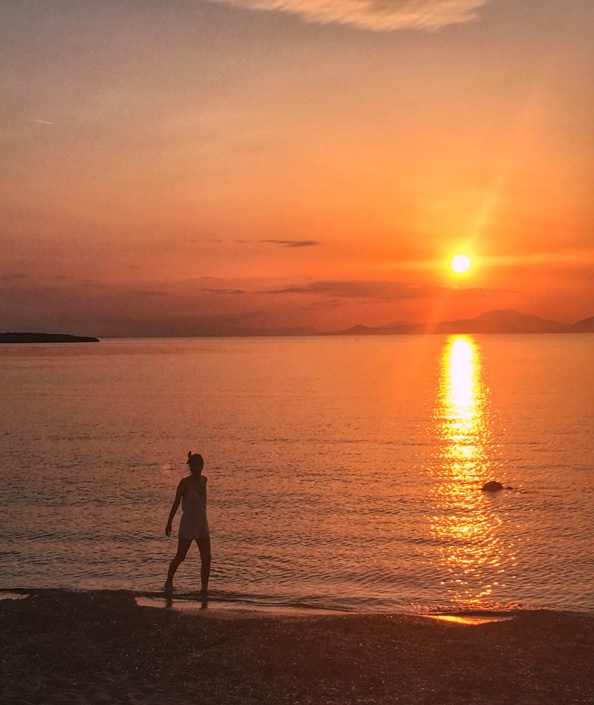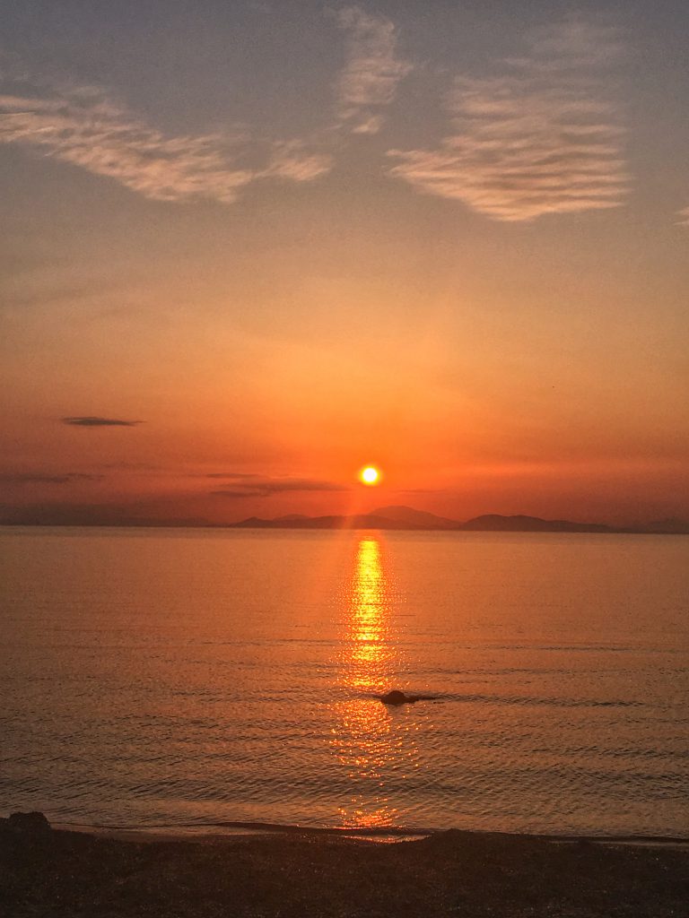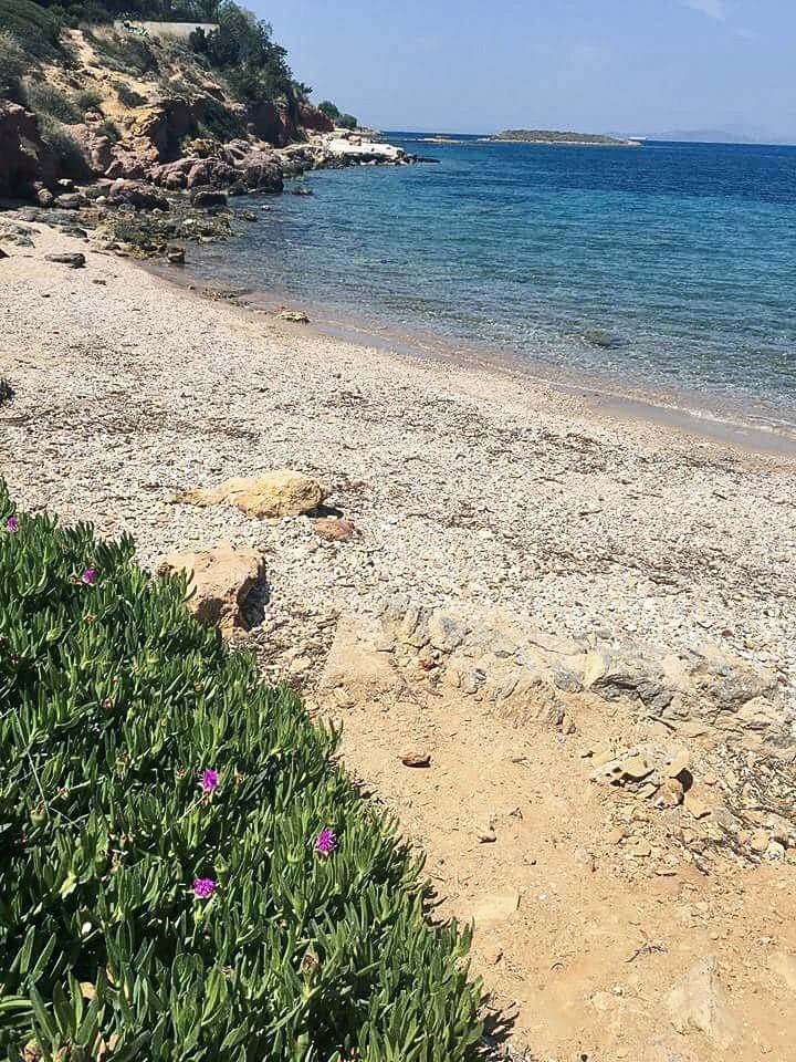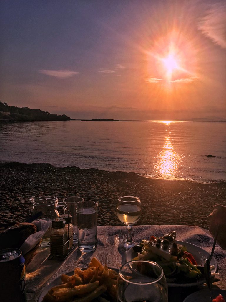 Трети ден – ще бягаме от стачките и жегата някъде извън Атина на плаж. Поне хубави места за плаж там има колкото щеш. Караме безцелно на юг, ще си харесаме нещо по пътя. Намерихме много готино място с естествен воден басейн в скалите, но не останахме там, защото по – скоро имаш чувството, че си отишъл на градски басейн, заради заведението, което е направено там – музика, шезлонги, чадъри, такива неща. Избрахме си по – непринудено местенце – Kavouri, приятен непренаселен пясъчен плаж. Ако сте чели Нашият втори дом – Тасос, ще знаете,че си падаме по безлюдни плажове. На плажа имаше една единствена таверна и убедих Камен да останем да вечеряме там и да гледаме залеза, вместо да се връщаме в стачкуващата Атина. Залезът беше фантастичен, храната също – непланираните неща често са най – сполучливи.