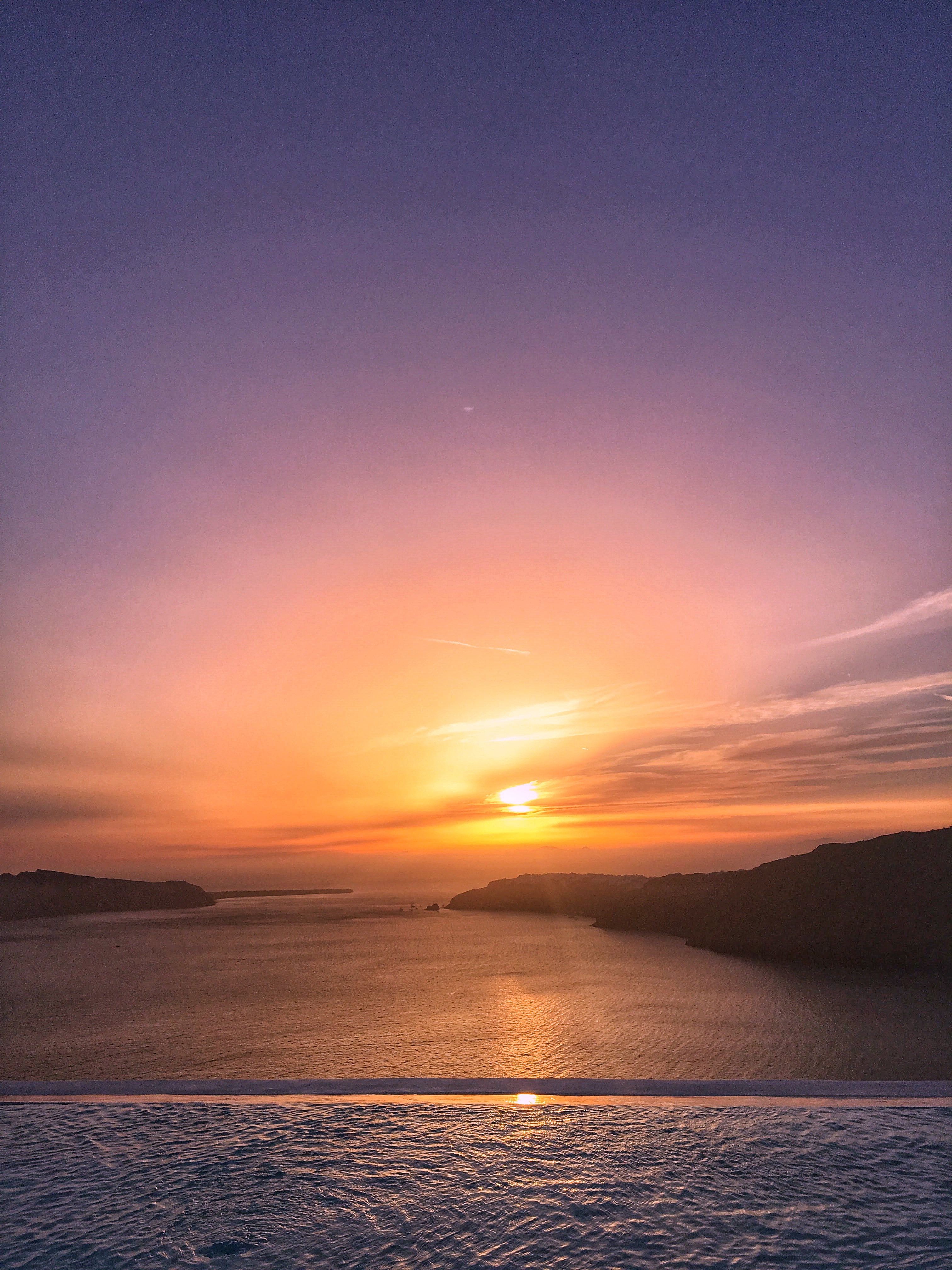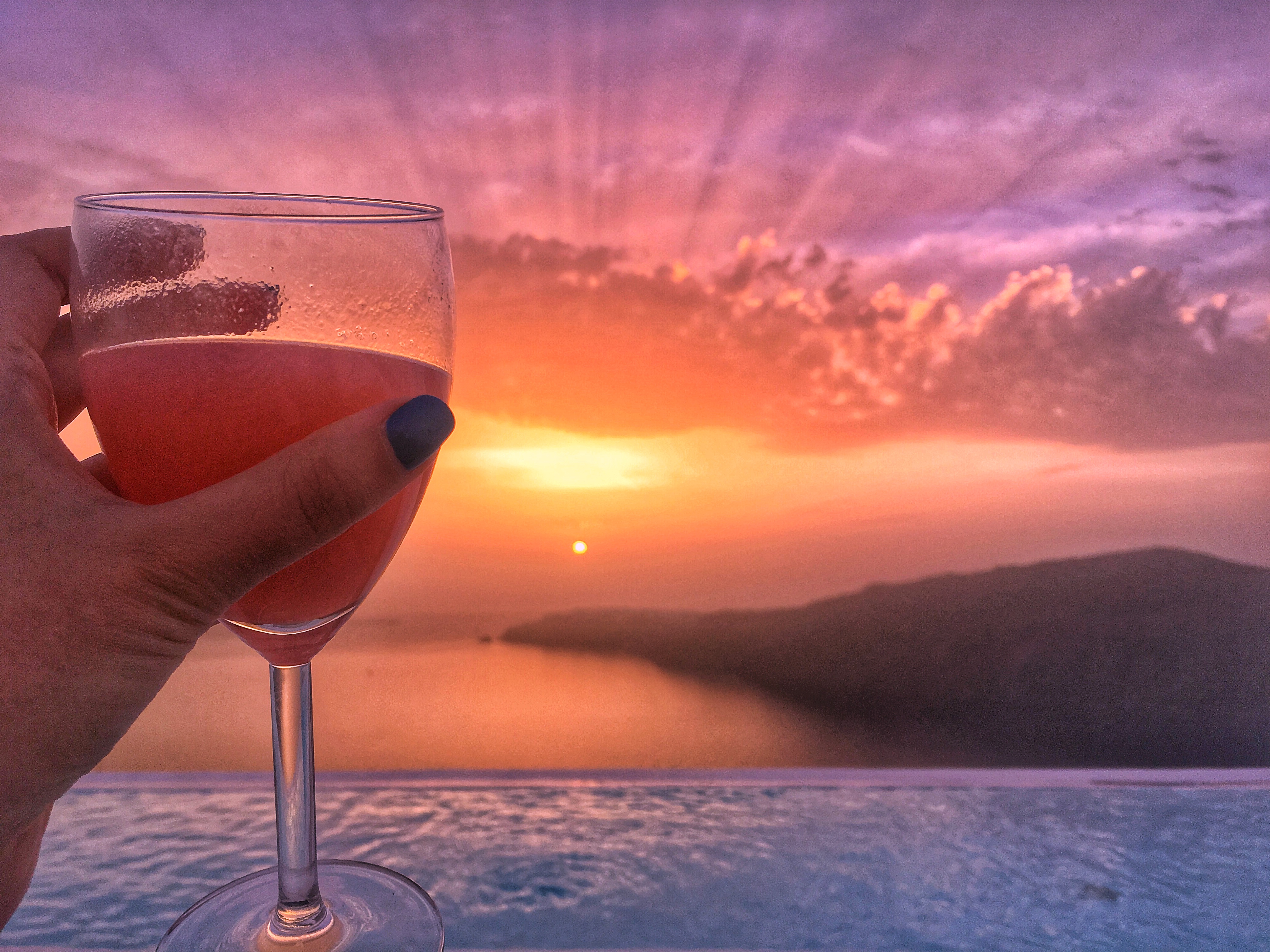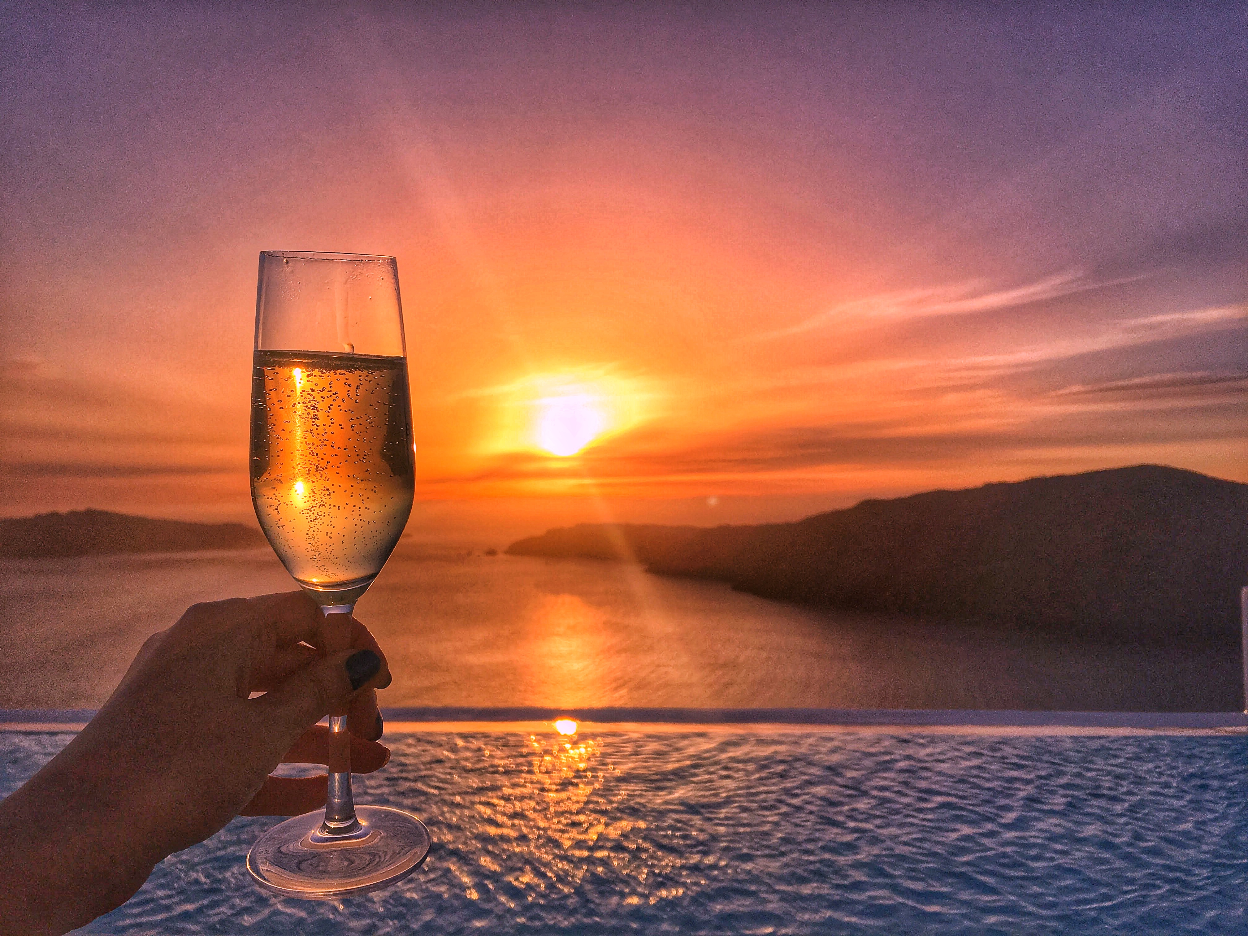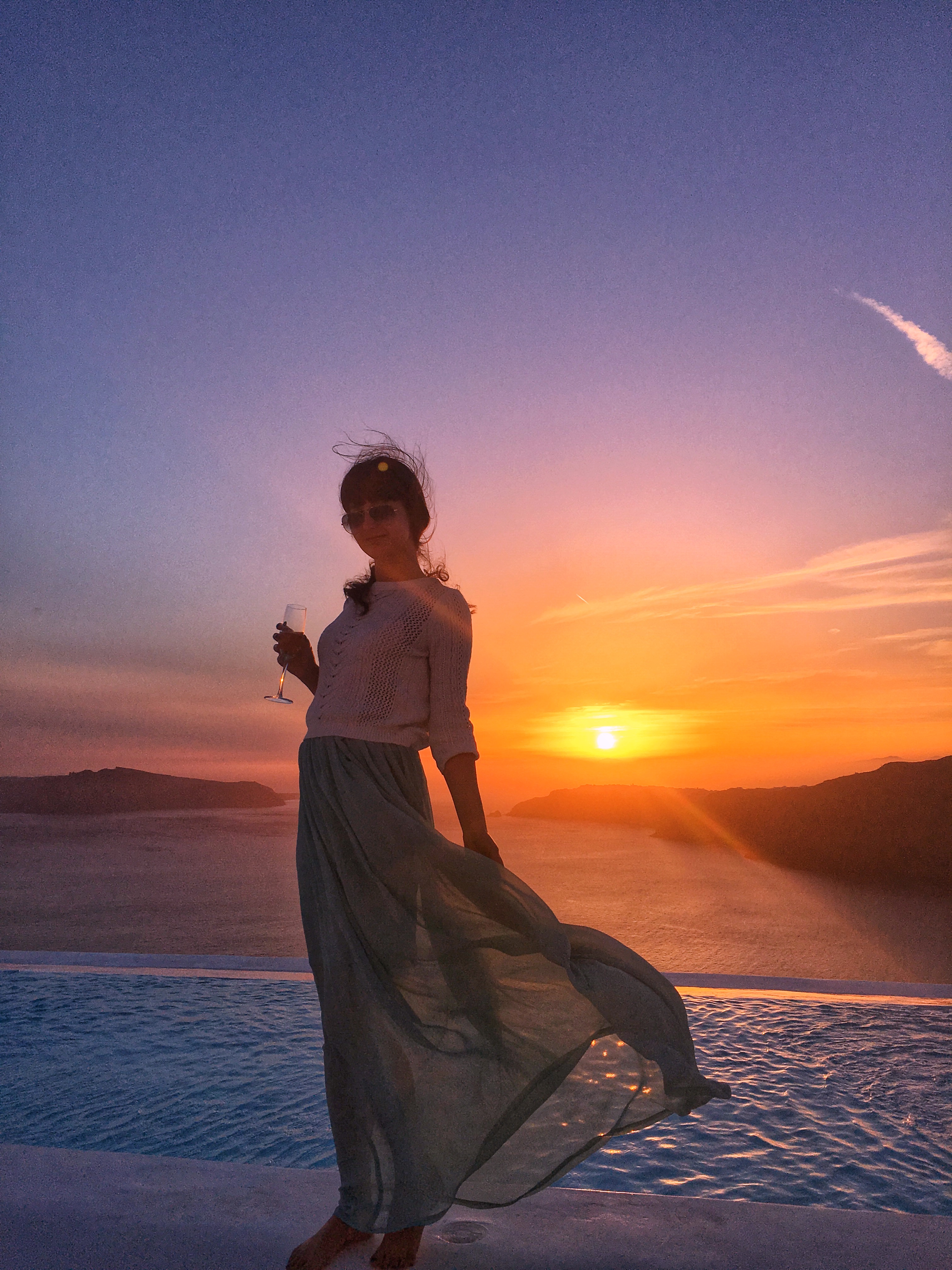 Този път решаваме, че ще наблюдаваме залеза от хотела, и без това имаме перфектна гледка там, предпочитаме да споделим момента само двамата, вместо с тълпите туристи. Настаняваме се на единия от басейните с една бутилка шампанско. По-романтично не може да е. Залезът е УАУ!