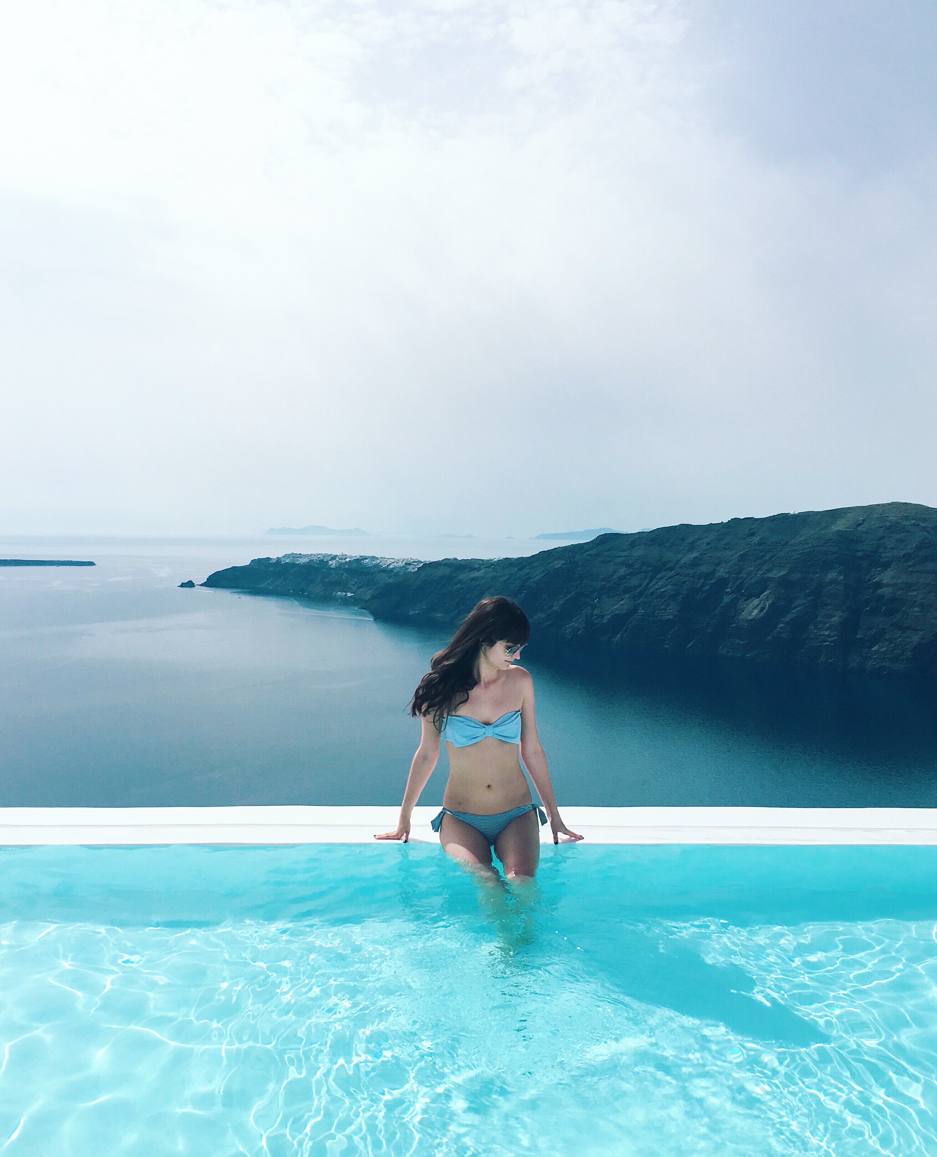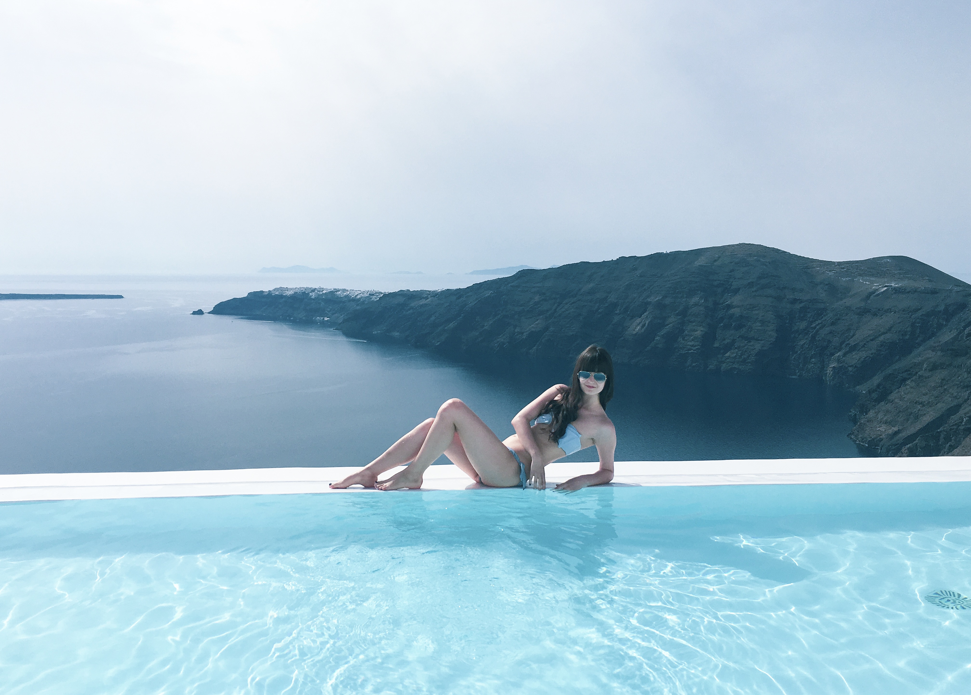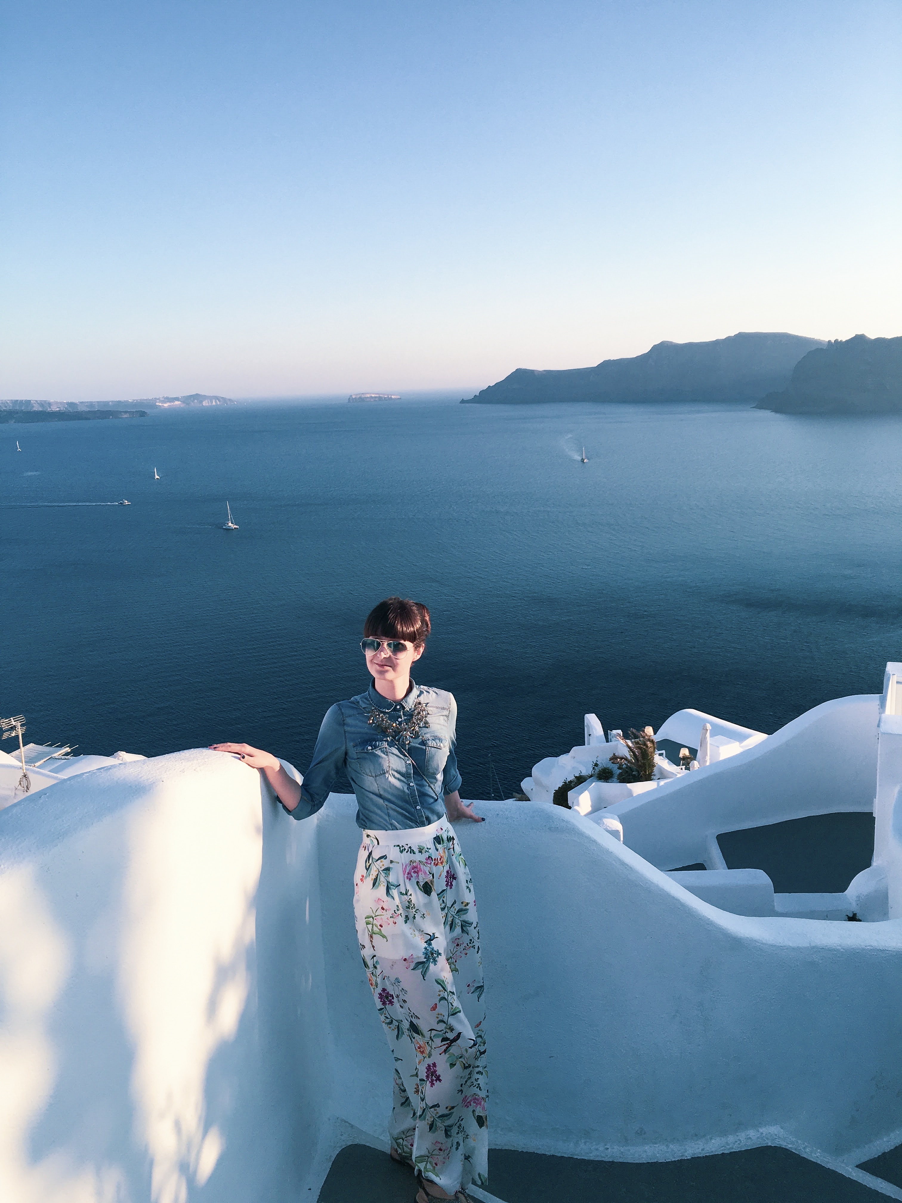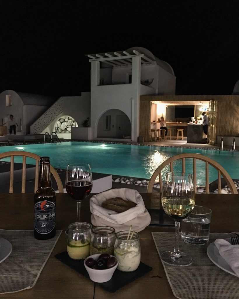 Този път решаваме, че ще наблюдаваме залеза от хотела, и без това имаме перфектна гледка там, предпочитаме да споделим момента само двамата, вместо с тълпите туристи. Настаняваме се на единия от басейните с една бутилка шампанско. По-романтично не може да е. Залезът е УАУ!