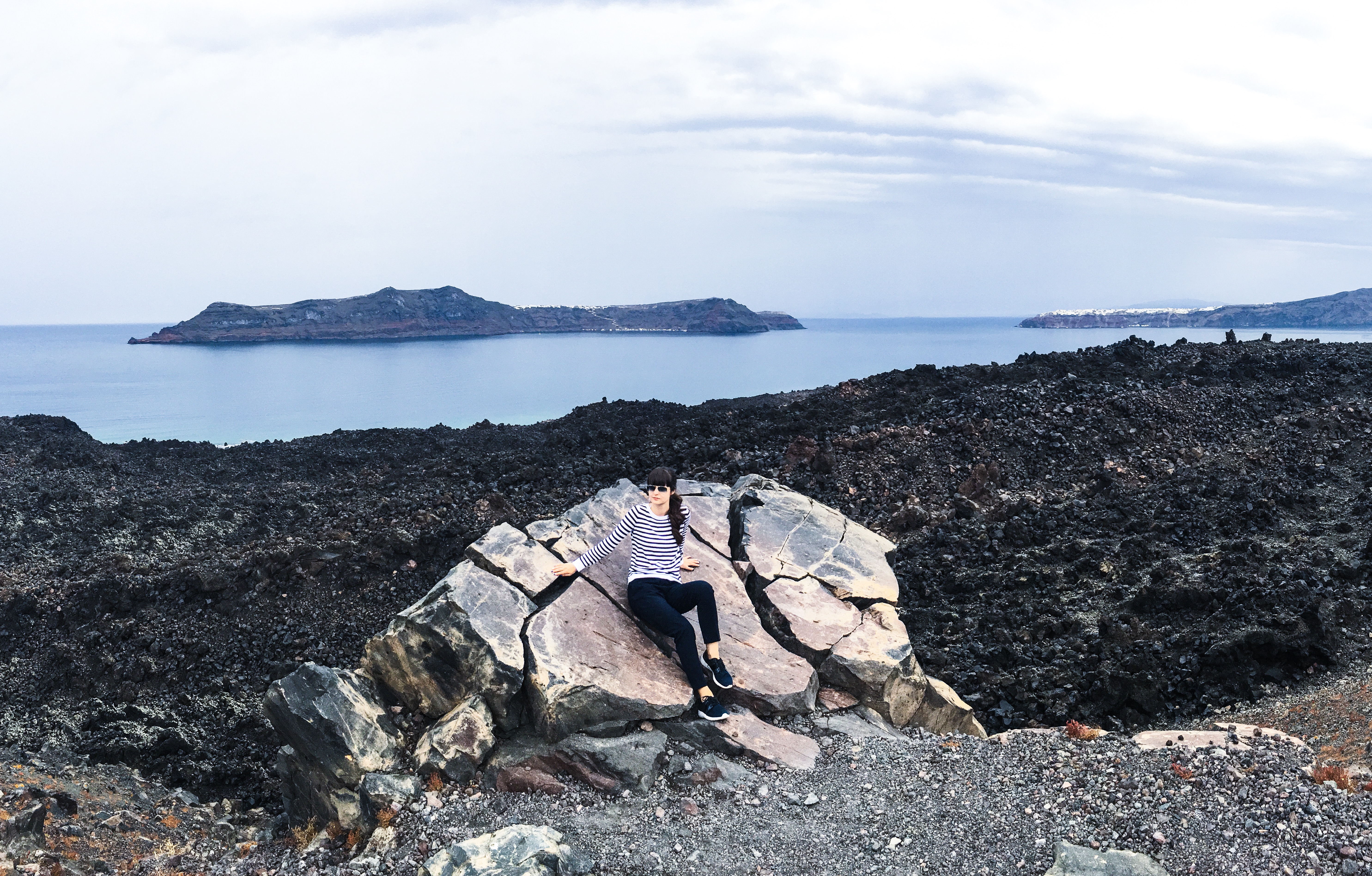 На следващия ден се отправяме към пристанището на Тира – има няколко начина за стигане – пеш по стълби (много стълби), на гърба на магаре,както вече споменах и с лифт. Ние избрахме лифта.Времето, за съжаление, не е благосклонно и продължава да вали. Обаче ентусиазмът не намалява – ще се разходим по активен вулкан!!! Екскурзията е с гид и когато слезеш на острова плащаш входна такса – около 2 евро мисля. Пейзажът е призрачен, растителност – почти няма, само черни камъни, остра миризма на сяра. Тук там от някоя дупка в земята излизат горещи пари. Усещането да си на такова място е невероятно. Успокоиха ни,че няма шанс вулканът да изригне, активността му се следяла зорко. След това отиваме с корабчето до естествените термални извори и който иска можеше да поплува вътре. Времето беше доста лошо и дъждовно и ние пропуснахме.