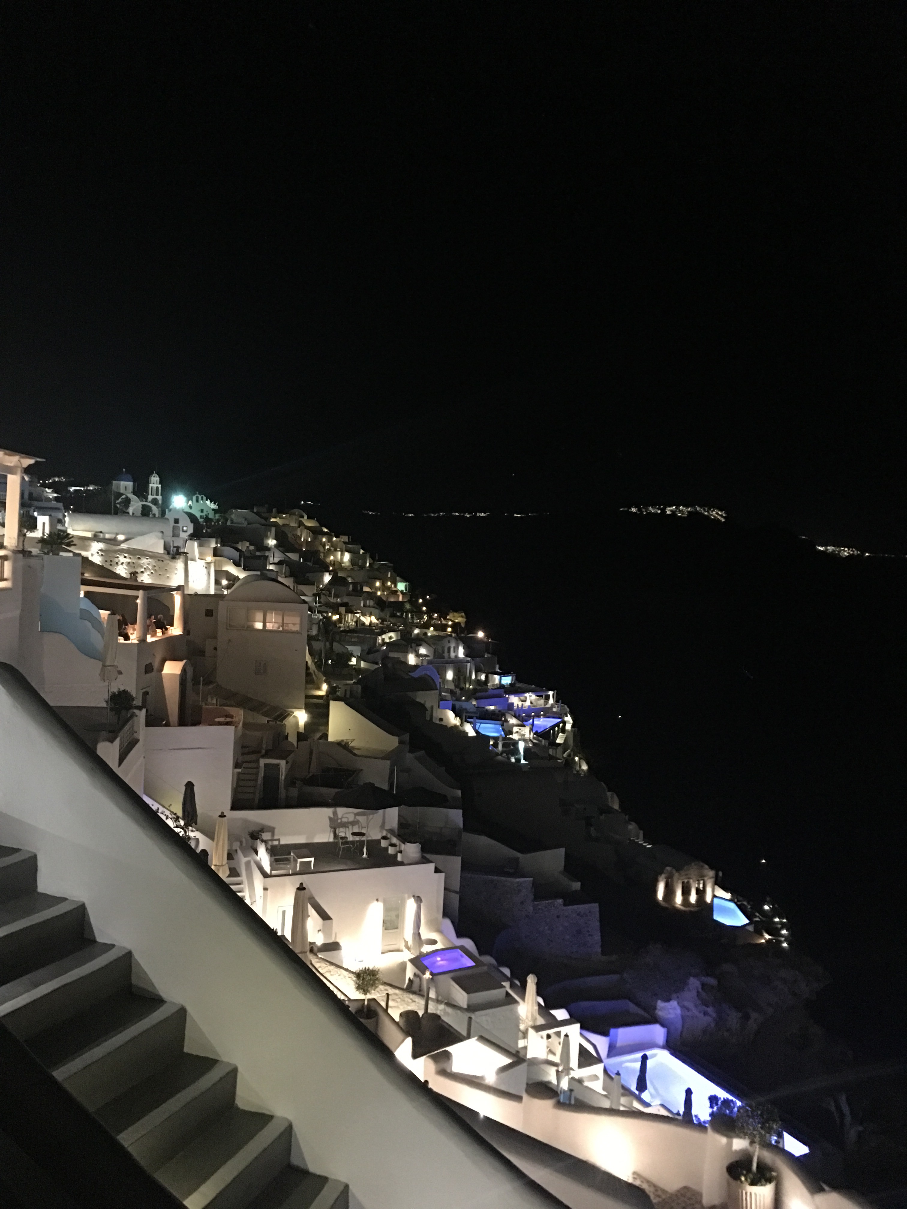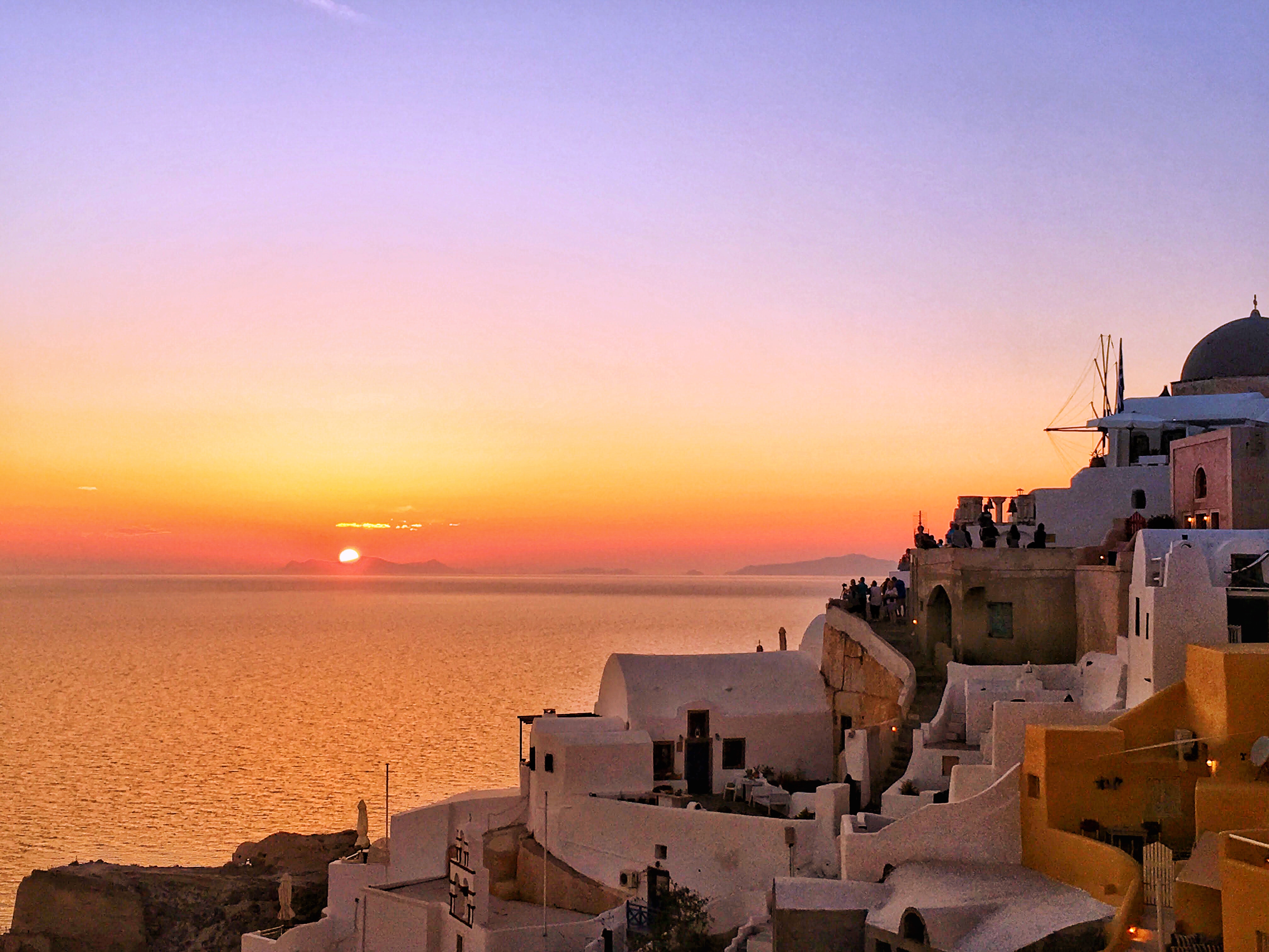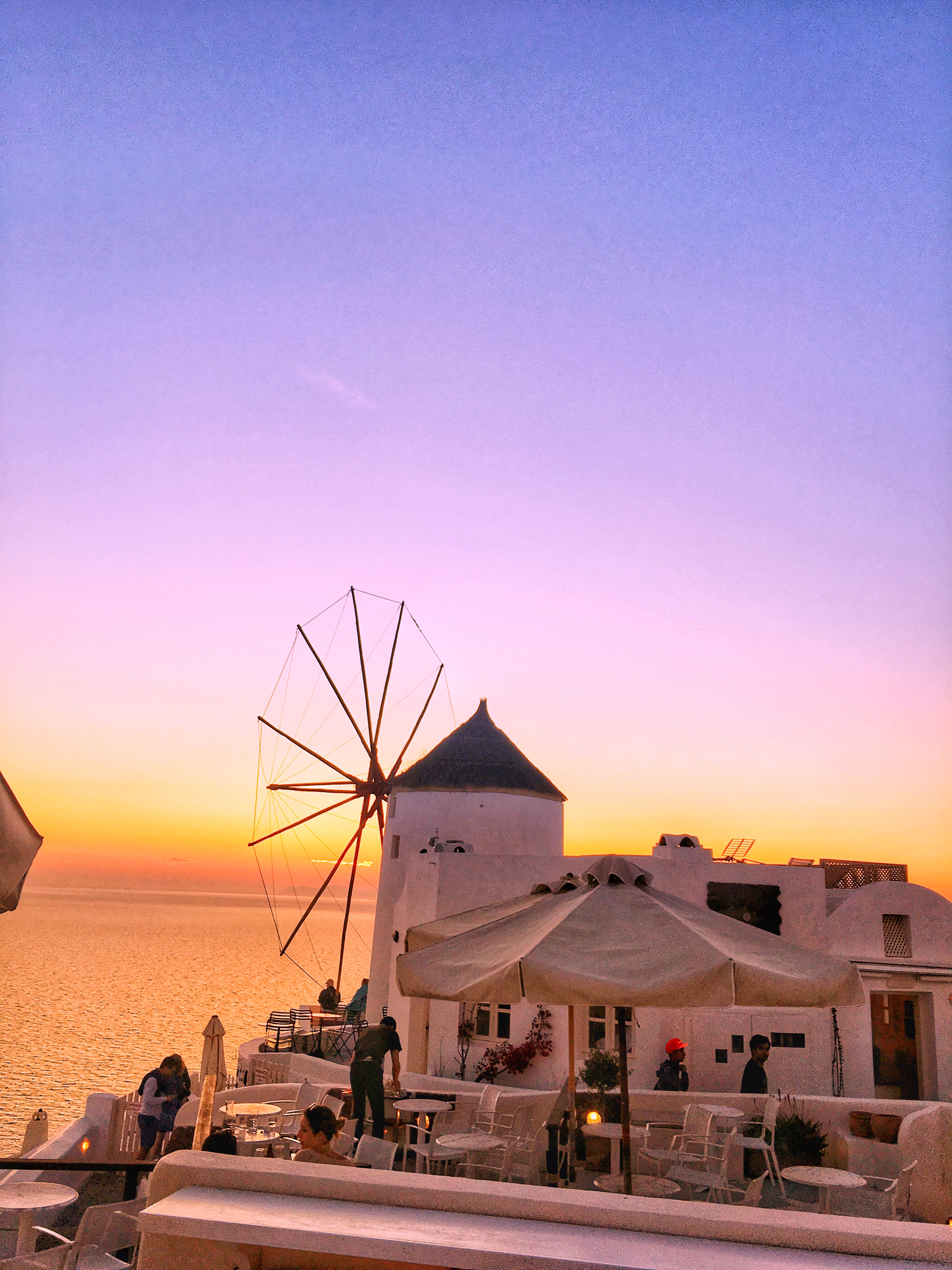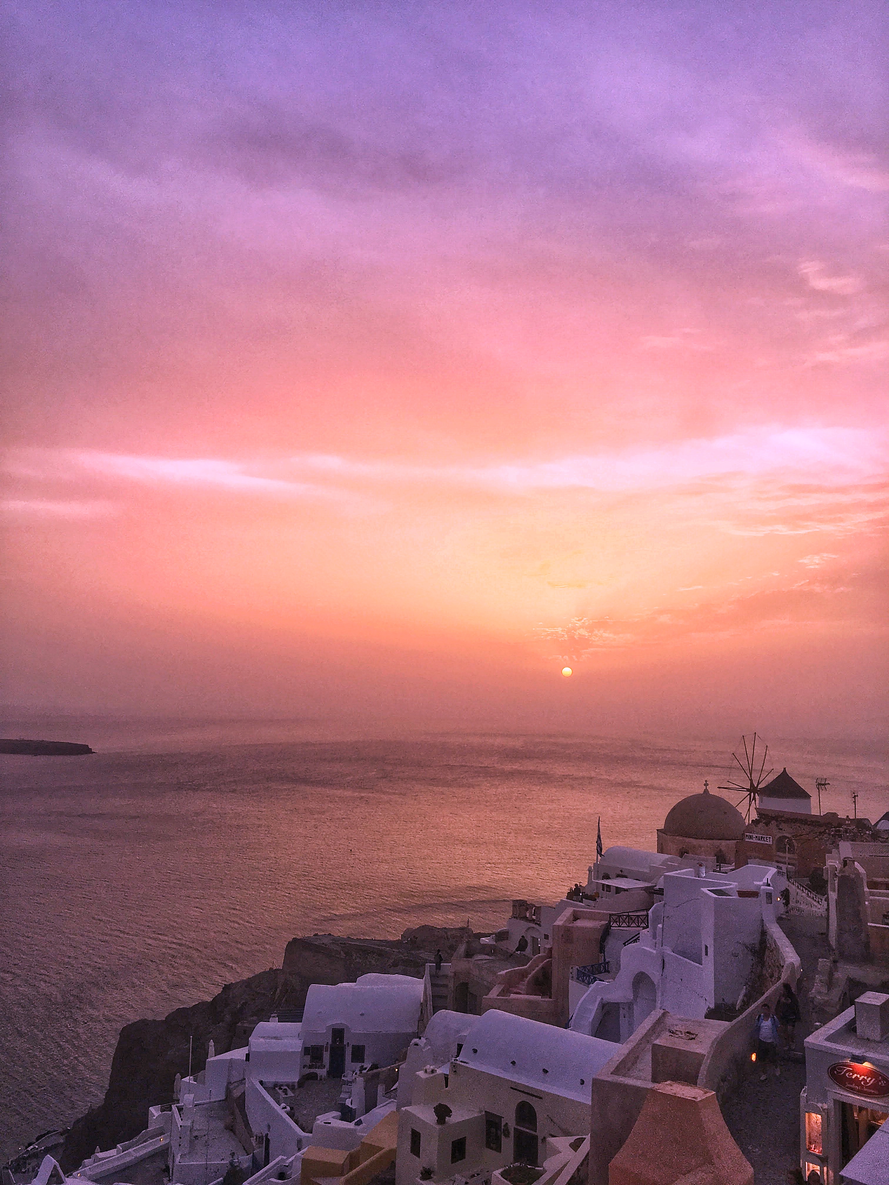 Първа вечер в Ия – каквото и да кажа за мястото, малко е! Бързаме да видим световноизвестния залез, най – известните локации са накрая на градчето, ще се ориентирате по човекопотока, наистина има мноооого хора. Всички са затаили дъх, кой с телефон, кой с камера, чакат да увековечат момента. Действително гледката е несравнима, да има и други места където можеш да видиш как слънцето се разтапя в морето от високо, но самия облик на мястото прави нещата различни – белите къщи и улички, силует на мелница, сините куполи на църквите. Магическо е наистина!