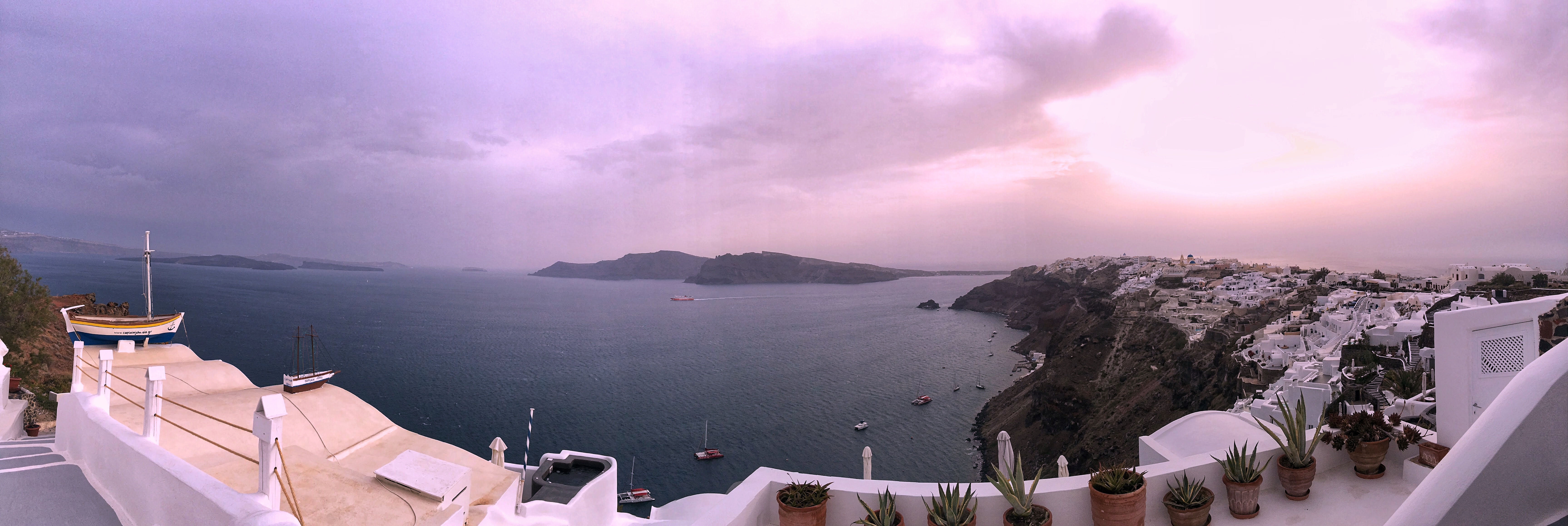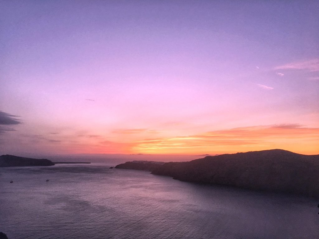 Последната вечер посветихме отново на залеза в Ия, но този път си намерихме локация далеч от тълпите – в началото на градчето, до хотел Captain John – ще го познаете по рибарската лодка,кацнала на покрива му. Оттам се открива гледка към цялата Ия и залеза. Беше облачно, но все пак красиво.